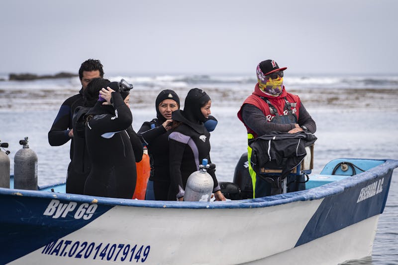 Sitting on the side of a small boat off the coast of Baja California, suited up in diving gear, a group of 10 women prepared to descend into the chilly waters.