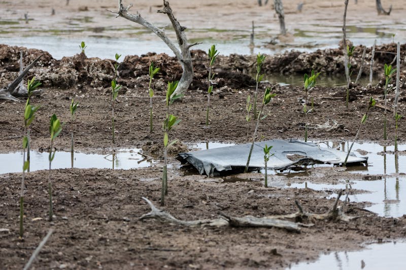 Flamingos feeding on fish and crustaceans are a sign the mangrove forest is beginning to recover.
