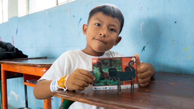 En la comunidad shuar de Chuwitayo, en Pastaza, 50 niñas y niños formaron un círculo en el patio de su escuela para participar en el taller “Descubre especies y reservas vitales”. Rodeados de árboles y aulas esperaban con entusiasmo el inicio de una jornada diferente. Pero traían algo más que cuadernos: una curiosidad infinita que no dejaba espacio para el silencio. ¿Qué vamos a hacer?”, preguntaban. “¿Cuáles son esos animales?”, insistían, tocando con asombro las figuras impresas del jaguar, del mono lanudo, la rana arbórea ninfa, entre otras.